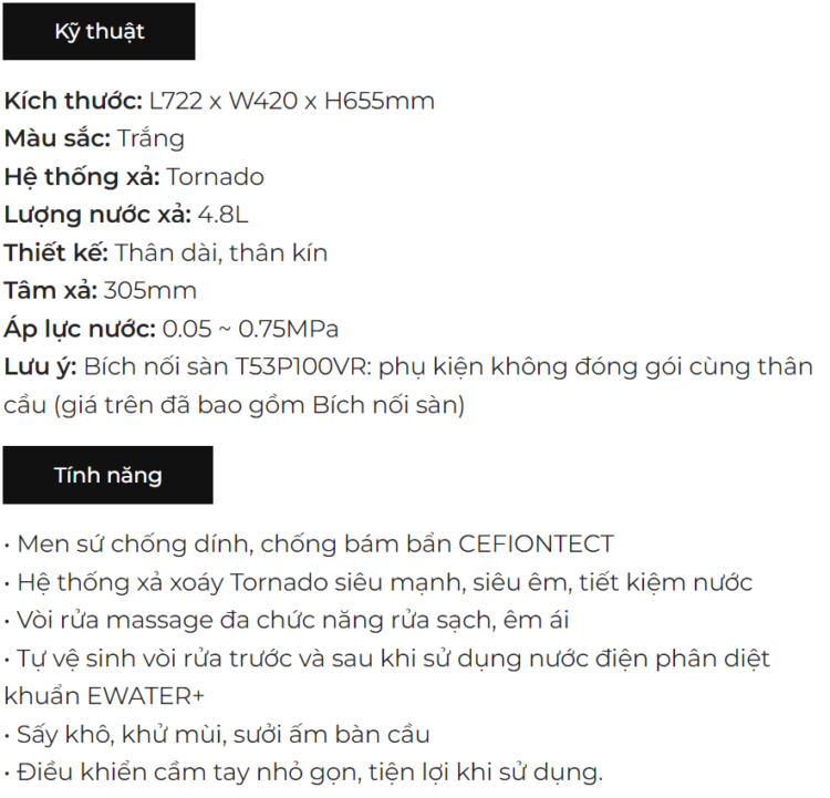 2.1. Hệ thống xả TORNADO tiết kiệm nước Với những bàn cầu sử dụng công nghệ xả nước thông thường sẽ dễ để lại các mảng bám và phải xả đi xả lại nhiều lần với một lượng nước lớn mới làm sạch thì ngược lại, bàn cầu một khối